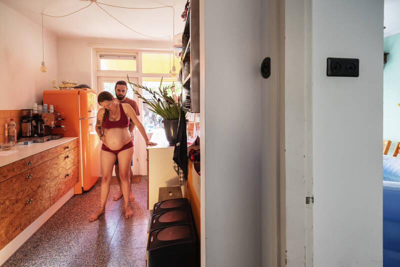 Het bad stond in de huiskamer al klaar en Anne (met haar ontzettende mooie buik) liep wat rondjes eromheen. Muziekje aan en tussendoor was ze super goed bezig de weeën op te vangen. En ik, ik volgde haar met mijn lens.