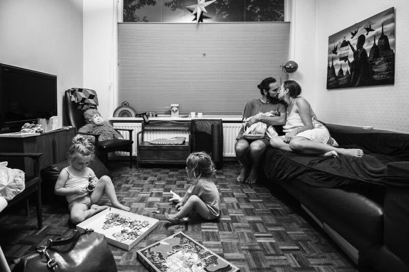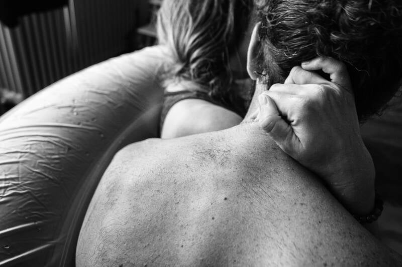 Niet lang nadat Anne in het bad was gaan zitten, vroeg ze aan haar vriend of hij erbij kwam. Ze waren echt ontzettend lief voor elkaar. De meisjes kwamen ook aan het bad staan en de VK en de kraamhulp stonden op een afstandje mee te kijken. Het was hun bevalling en zouden het samen doen.